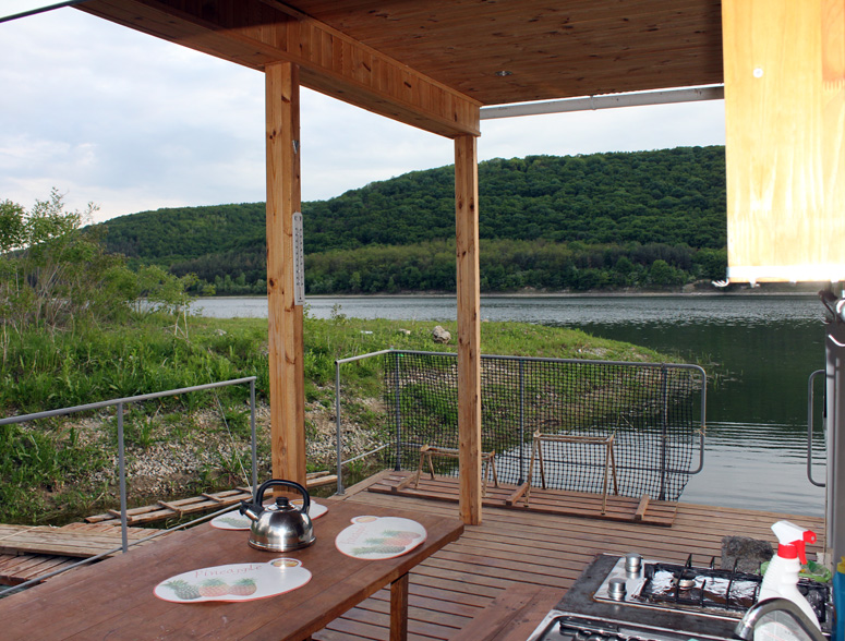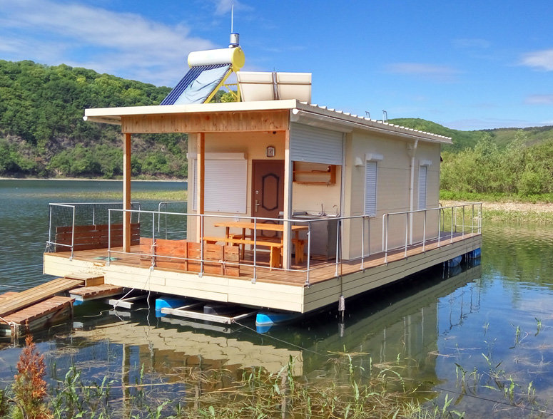 За яким маршрутом плаває будинок?  Він стоїть в одному місці, бо на березі є необхідна інфраструктура: питна вода, мангал, Wi-Fі, гальковий пляж, місце для стоянки авто, тощо.